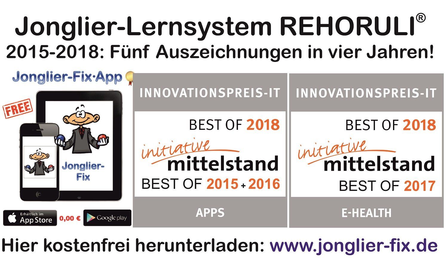 Die Initiative Mittelstand hat uns beim Innovationspreis IT erneut mit dem BEST-OF-Prädikat ausgezeichnet. Nach 2015 und 2016 in der Kategorie „E-Health“ und 2017 in der Kategorie „Apps“ wurde das Jonglier-Lernsystem REHORULI® 2018 erstmals in beiden Kategorien mit dem BEST-OF-Prädikat geehrt.